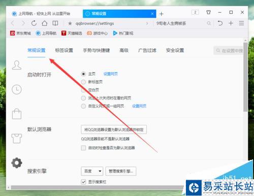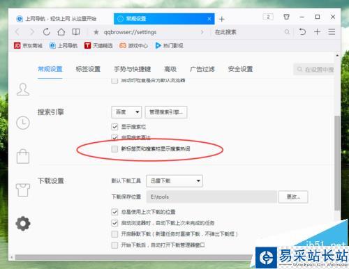 6、在“常規設置”選項卡中,找到“搜索引擎”下的“新標簽頁和搜索欄顯示搜索熱詞”選項,并將其取消勾選即可。如圖所示;