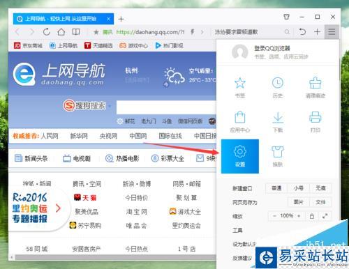 4、點擊“設置”命令選項后,這個時候會彈出瀏覽器“設置”對話窗口。如圖所示;