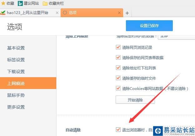 6、在“上網(wǎng)痕跡”選項(xiàng)的右側(cè)窗格中,勾選要清除的上網(wǎng)痕跡。向下拖動(dòng)滾動(dòng)條,找到“自動(dòng)清除”選項(xiàng)下的“退出瀏覽器時(shí),自動(dòng)清除上面勾選的數(shù)據(jù)”并將其勾選即可。如圖所示;