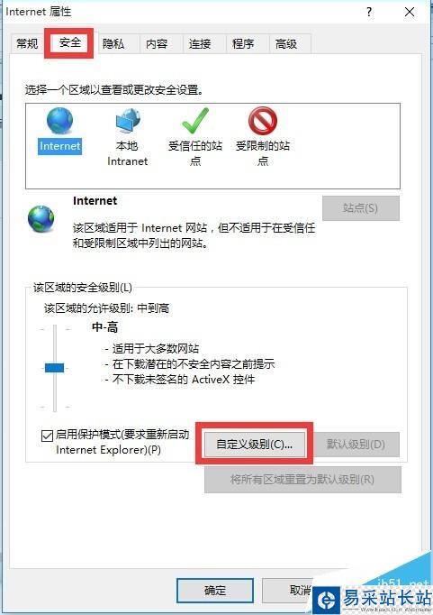 2、從打開的“Internet選項”窗口中,切換到“安全”選項卡,點擊“自定義級別”按鈕進入。