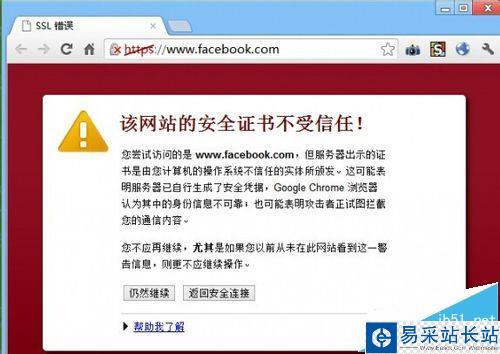 2、當我們嘗試訪問“未經認證的安全證書”網站時,通常會給出如圖所示的“安全”提示界面,不過我們仍然可以通過點擊“繼續訪問”按鈕以訪問此網站。