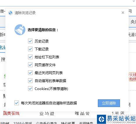 2、選擇全部清除項,確認即可。每次關閉瀏覽器清除,根據個人需要。建議默認不選。