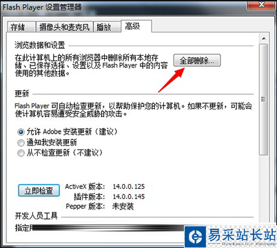 第三步:檢查更新,將FlashPlayer升級至最新版本;