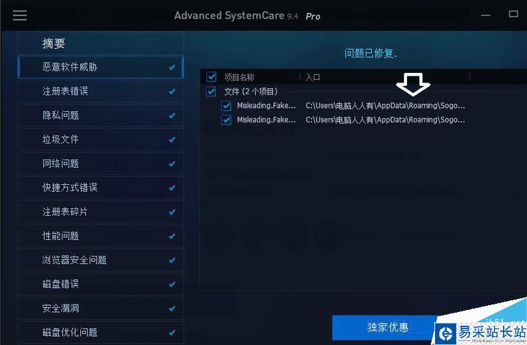 搜狗瀏覽器被劫持,使用Advanced SystemCare優化軟件→勾選惡意軟件清除→掃描。