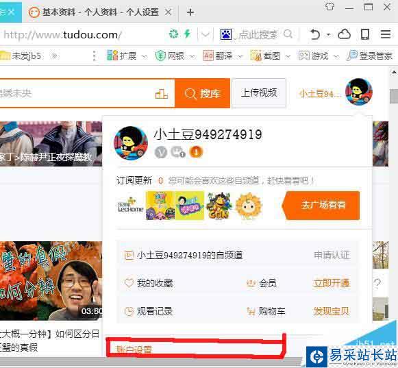 2、點擊自己的賬號頭像以后,可以看到下拉菜單中有“賬戶設置”,點擊進入找到土豆默認的昵稱,如下圖所示。