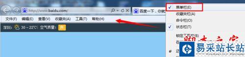 在IE空白區(qū)域右鍵勾選“菜單欄”項目,如下圖。勾選之后,就能顯示出來了