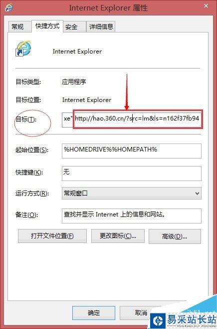 我找到 IE 瀏覽器的快捷方式,查看其它屬性,發現目標中有 hao.360.cn的字樣,嘗試刪除360相關內容失敗后直接刪除快捷方式