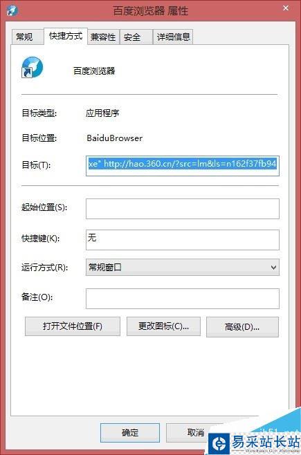 如果你還安裝有其它瀏覽器,那么其對應的快捷方式屬性也是同樣已經被修改。例如百度瀏覽器。