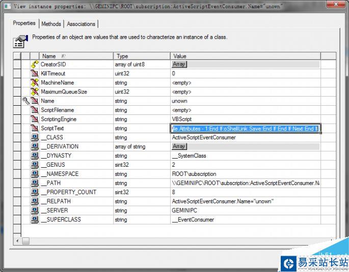 點擊左側_EventFilter:Name="unown_filter",再至右側右鍵點擊ActiveScriptEventConsumer Name="unown",選擇view instant properties,