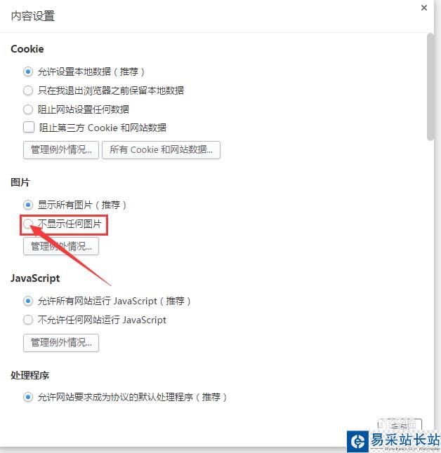 5、在內容設置跳出界面中的不顯示圖片前面點上綠點,點擊【完成】。如下圖片中所示