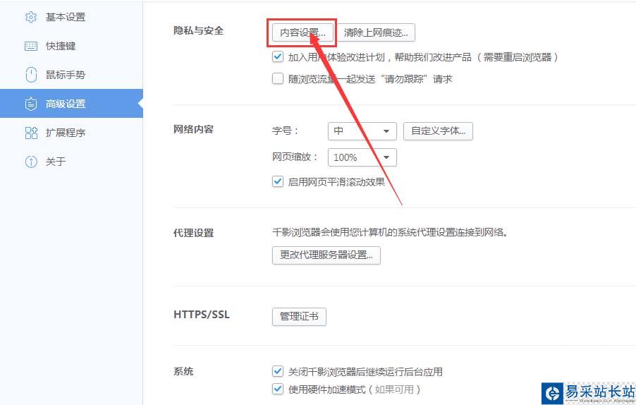 4、點一下右邊的“隱私與安全”中的“內容設置”,如下圖片中所示