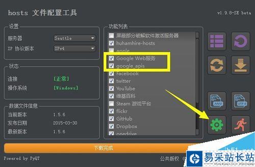 待地址數(shù)據(jù)文件下載完成后,確保勾選“Google Web服務(wù)”和“Google apis”兩項,點擊“更改Hosts”按鈕。