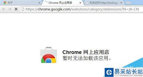 首先我們來看一下具體癥狀,當訪問“google應(yīng)用商店”時,顯示如圖所示的“Chrome網(wǎng)上應(yīng)用店暫時無法加載該應(yīng)用”的操作。