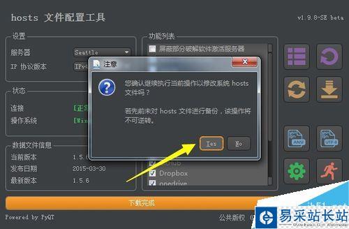 此時將彈出如圖所示的“注意”窗口,直接點擊“Yes”按鈕,即可完成對本地計算機中Hosts文件的修改操作。同時重新修改“Google應(yīng)用商店”的服務(wù)器地址。