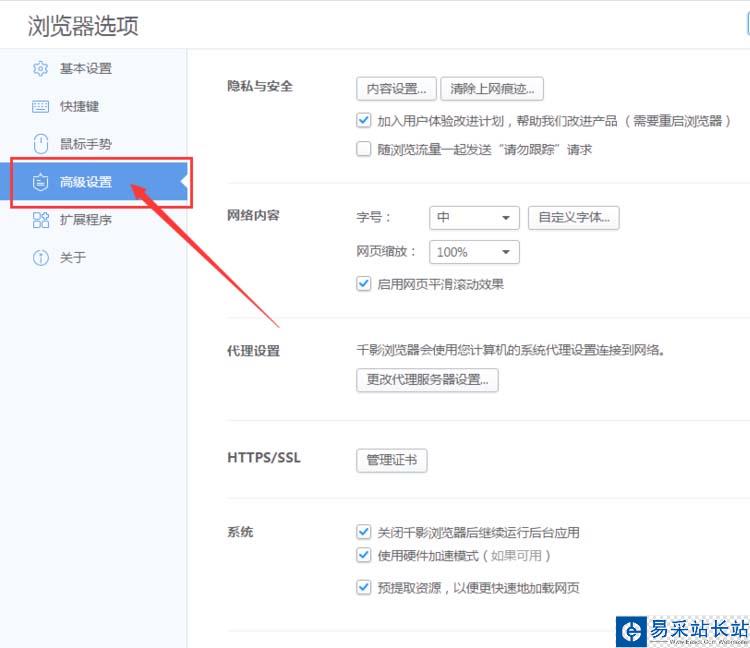 4、在設置界面【瀏覽器選項】中找到【高級設置】點擊進入