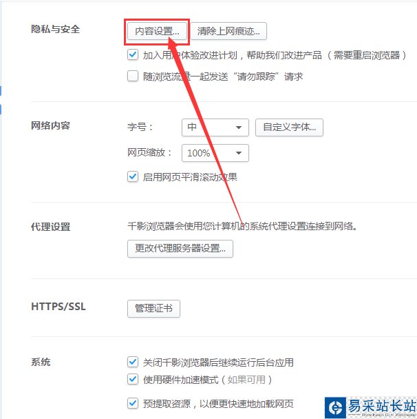 5、在高級設置界面看到隱私與安全中的【內容設置】點擊進入