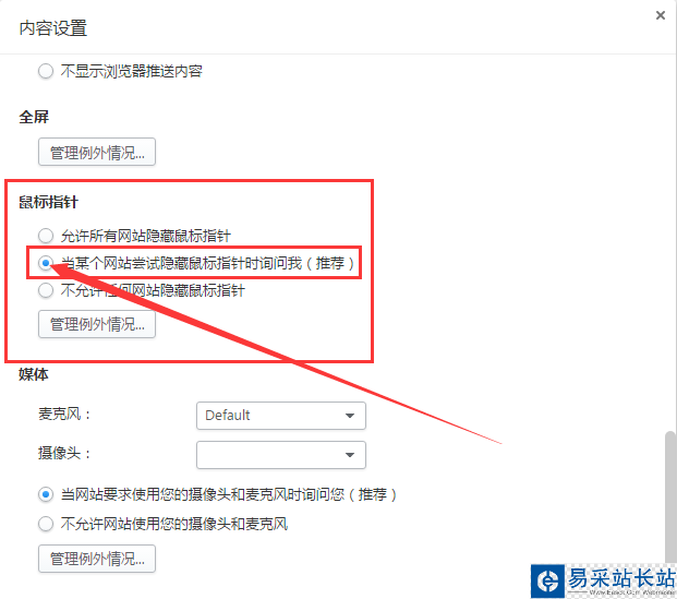 6、跳出內容設置界面往下拉找到【鼠標指針】中的【當某個網站嘗試隱藏鼠標指針時詢問我】前面打上點,最后點擊【完成】就好了。