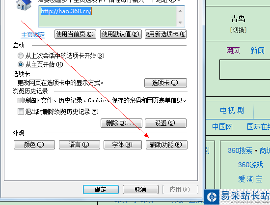 3、在Internet選項中,如下圖所示,找到輔助功能。點開輔助功能。
