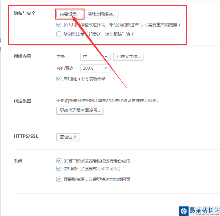 5、進入高級設置界面找到【隱私與安全】中的【內容設置】點擊進入