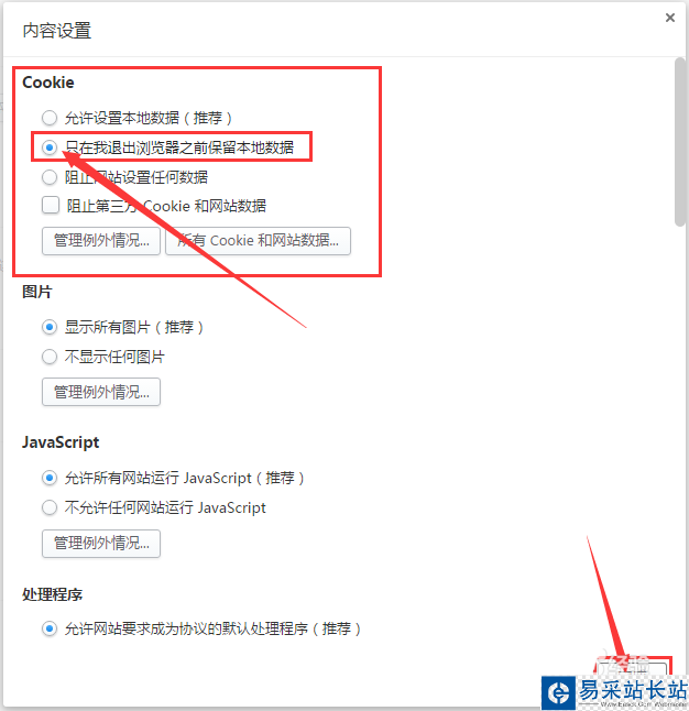 6、進入內容設置界面就可以看到【Cookie】在其中找到【只在我退出瀏覽器之前保留本地數據】并在其前面打上點,最后點擊【完成】