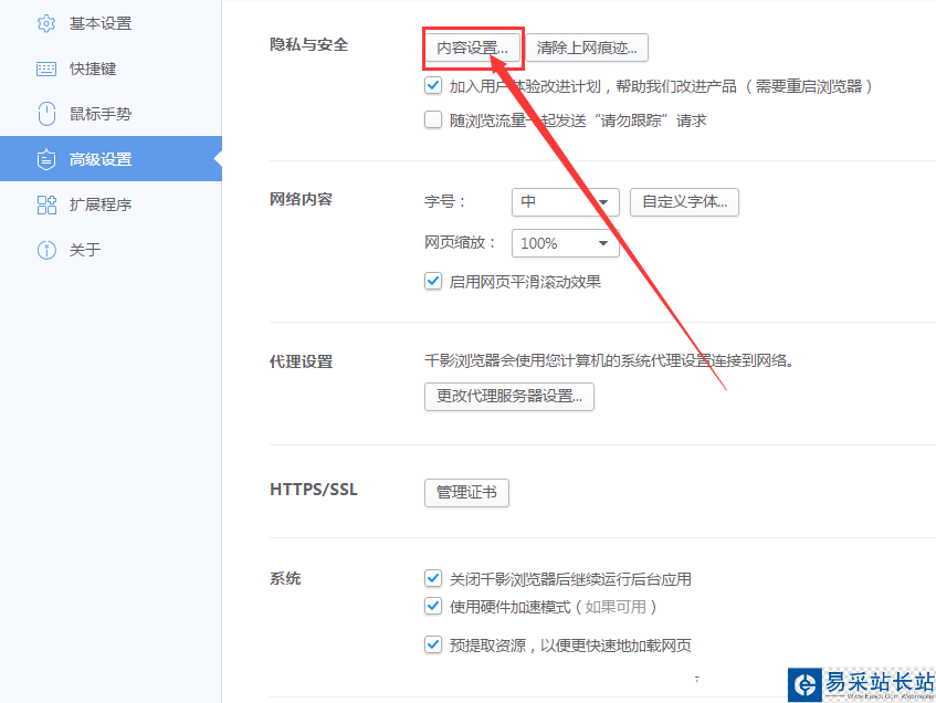 5、進入高級設置后可以看到【隱私與安全】中的【內容設置】點擊進入