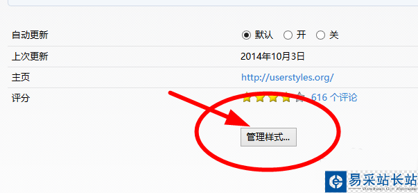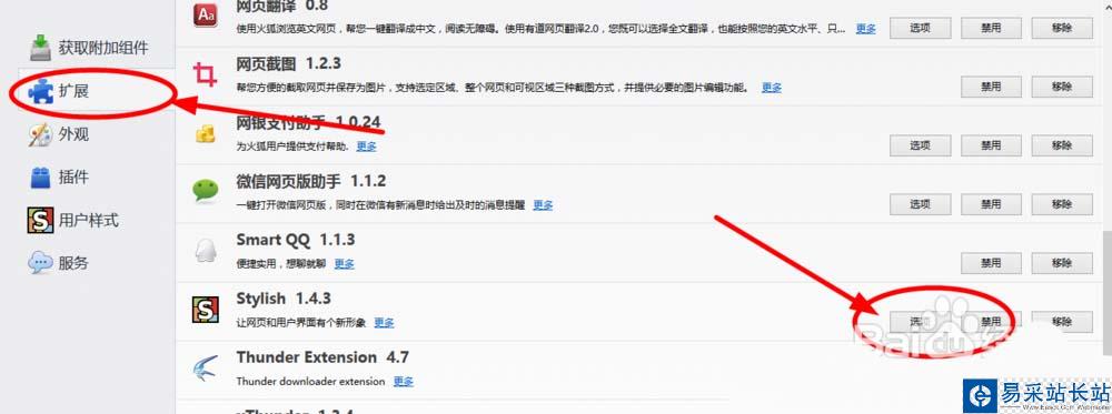 4、這時我們回到下圖所示的地方,點擊擴展,找到Stylish,點擊選項。進去之后點擊管理樣式