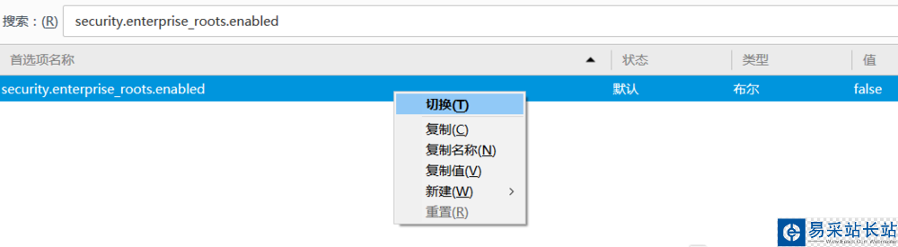 5、點擊搜到到的項目,鼠標右鍵,選擇“切換”,此時,對應的值會從false變為true;