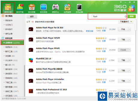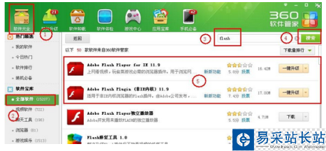 7. 在打開的軟件管家中,我們搜索flash,可以看到【adobe flash player for IE】以及【adobe flash player Plugin(非IE內(nèi)核)】這兩個軟件