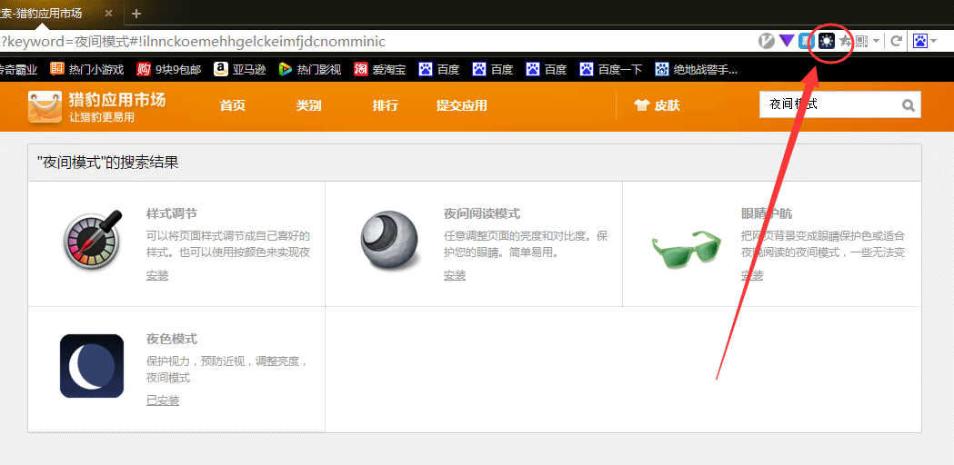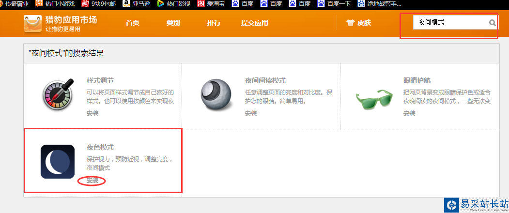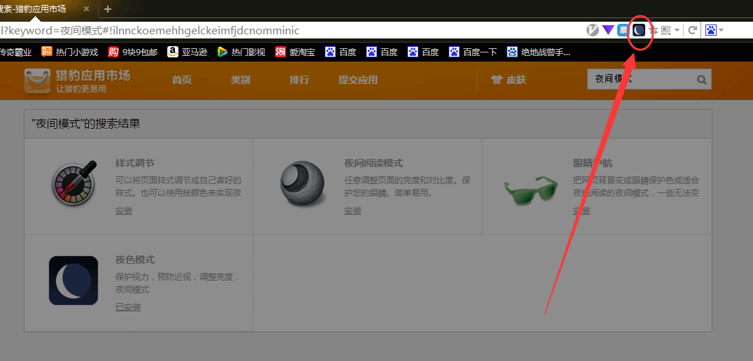 2、接著在獵豹應(yīng)用市場(chǎng)中搜索“夜間模式”然后點(diǎn)擊安裝即可;