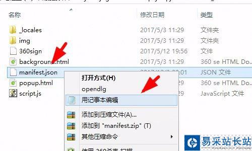 4、將地址保持之后接著右鍵單擊其中的manifest.json文件,使用記事本將它打開