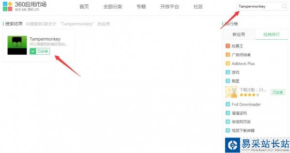 1、打開360瀏覽器的插件擴(kuò)展中心,然后直接搜索Tampermonkey”: