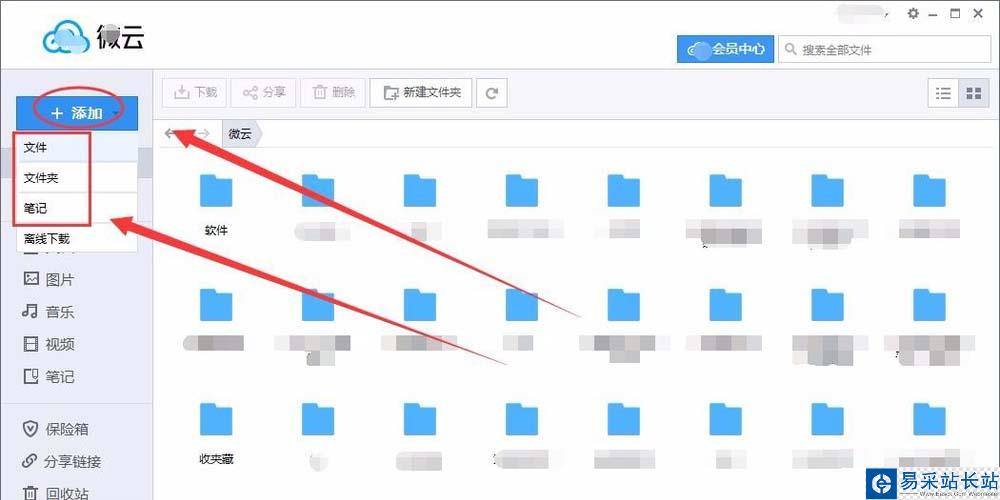 3、單擊添加按鈕,可以向微云中添加文件、文件夾和筆記。