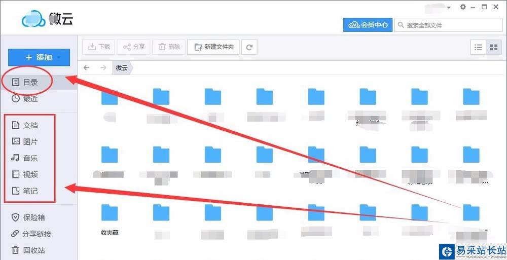 1、打開微云窗口后,單擊目錄選項,可以查看微云中的所有文件,還可以根據(jù)文檔、圖片、音樂、視頻等分類查看文件。