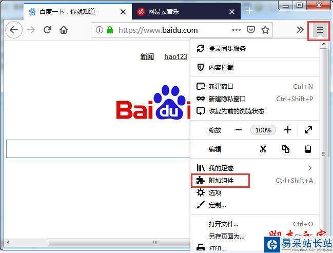 2、點擊瀏覽器右上角的菜單,然后點擊附件組件,如圖: