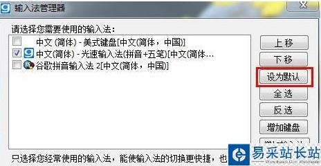 右鍵出現的列表框中選擇“輸入法管理器”,如下圖,然后選中光速輸入法,點擊右側的“設為默認”按鈕。