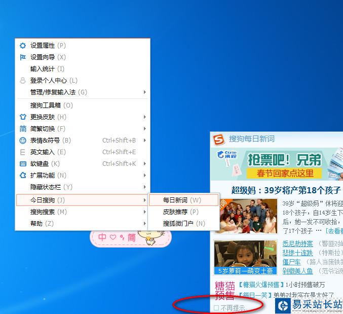 5、右鍵單擊左側選中【今日搜狗】——每日新聞——搜狗每日新詞——勾選不再提示;