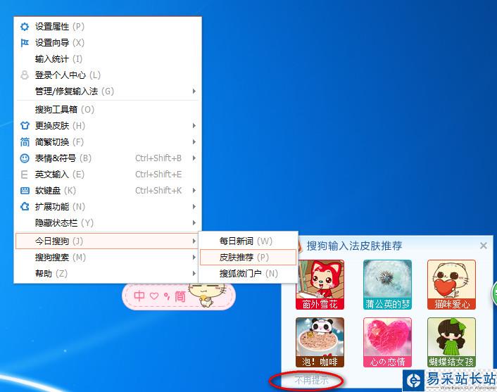 6、選中【今日搜狗】——皮膚推薦——搜狗輸入法皮膚推薦——勾選不再提示;