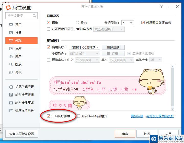 2、在屬性設置中選中【外觀】——取消【開啟皮膚推薦】——【確定】;當需要更換皮膚時可以自行去更換;