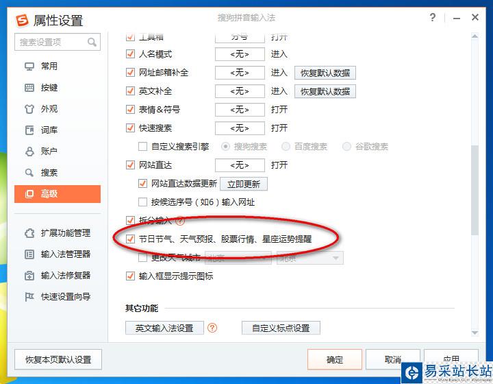 4、在屬性設置中選中【高級】——取消勾選【節日節氣、天氣預報、股市行情、星座運勢等提醒】——【確定】