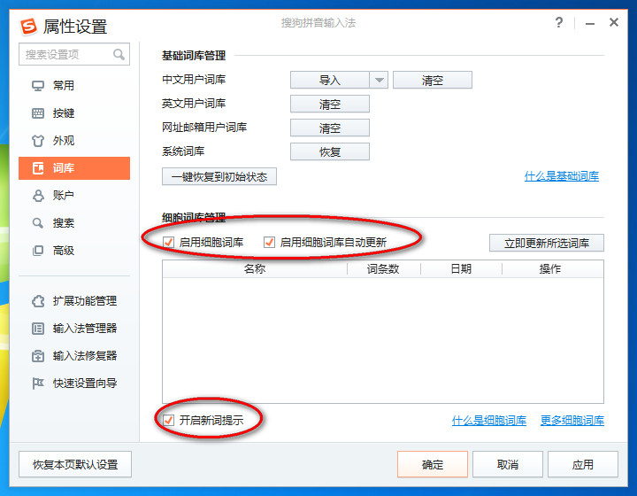 3、在屬性設置中選中【詞庫】——取消【開啟新詞提醒】【啟用細胞詞庫自動更新】——【確定】;詞庫更新讓可以通過設置實現后臺自動更新,沒必要開啟提醒這樣只會增加彈窗;