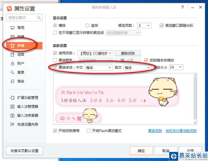 2、在“屬性設置”對話框中選擇“外觀”選項卡中的勾選“更換字體”然后在右邊設置你要的中英、文字體以及字體大小單擊確定