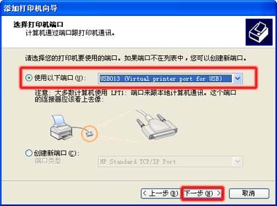 在“選擇打印機端口”窗口中,從“使用以下端口”下拉列表中選擇 USB 端口,然后點擊“下一步”按鈕。