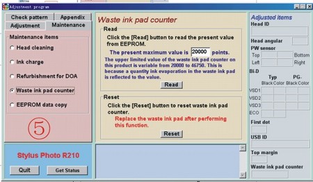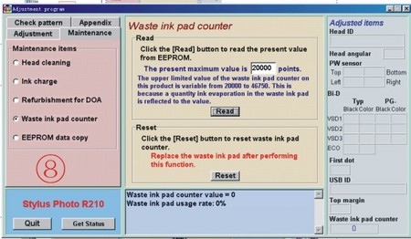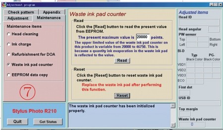 點擊“READ”下面藍色消息框中顯示廢墨倉的當前狀態,看看數字是否超過20000。