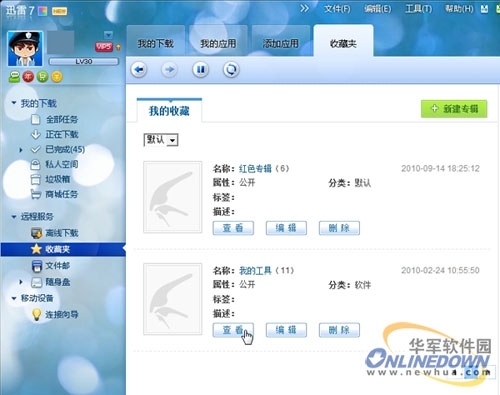 以后不管在哪里,只要下載和安裝最新版迅雷7,然后輸入會員用戶名和密碼,再單擊“遠程服務”下方的“收藏夾”按鈕,就可以看到我們的專輯(如圖5,也可以單擊“新建專輯”按鈕來創建新專輯),進入相應專輯后,就看到我們收藏的資源。選中這些資源,單擊“下載”按鈕即可下載并使用(如圖6)。
