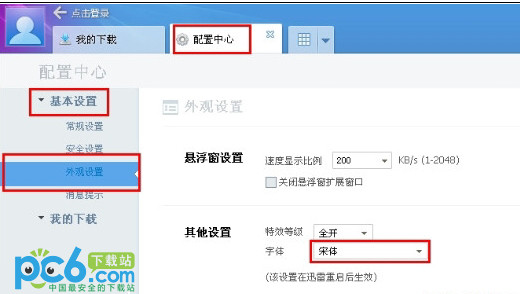 在迅雷7的“配置中心”可以對軟件的字體設置。打開“配置中心”,選擇“基本設置”,選擇“外觀設置”,在右邊的“其他設置”中,可以更改字體,將字體設置為“宋體”。