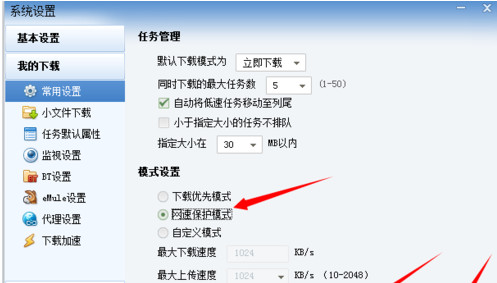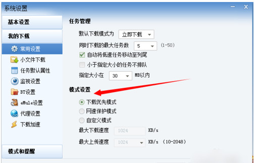 進入我的下載以后,就是常用設置了。在常用設置下,找到“模式設置”。在模式設置中,可以看到迅雷是默認的下載優先的模式。