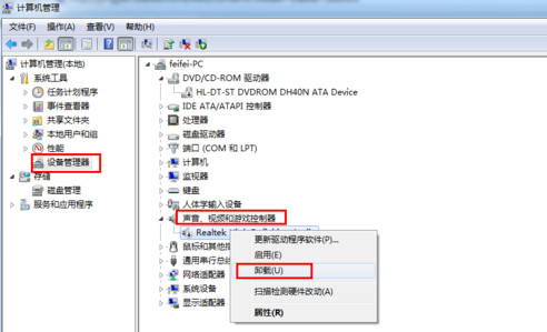 然后找到設備管理器,找到聲音、視頻和游戲控制器然后你再點擊卸載