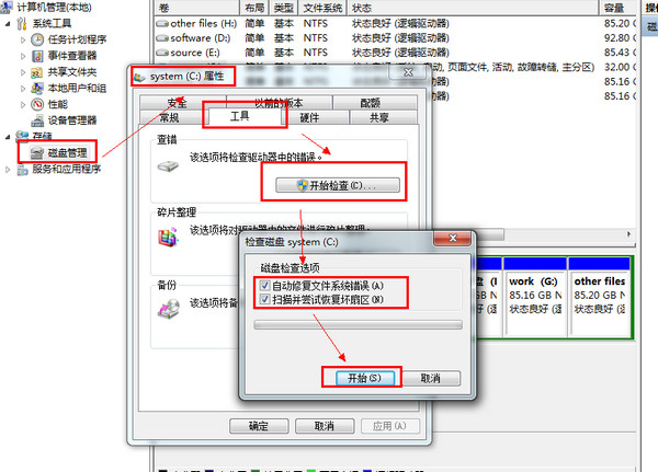邏輯損壞(軟件及系統原因):右鍵計算機--管理--磁盤管理--選擇卷符(如C盤)右鍵屬性--工具--開始檢查,都勾選上,這樣對每個盤符進行修復:
