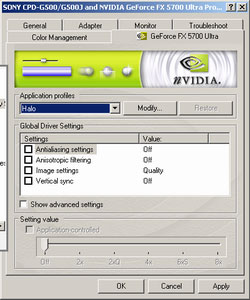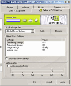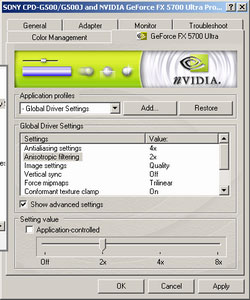 從上面的截圖中,你可以看到一些新的變化。對于游戲玩家最明顯的就是,現在OpenGL和Direct3D設置面板已經二合為一。在Performance和Quality面板里,你必須就全屏抗鋸齒,異向性過濾,畫面質量進行一一設定,而不是象以前那樣一齊搞定了。這意味著你的設定過程會比以前更繁瑣一點,可能大多數用戶并不喜歡這樣的改動。在高級設定選項中,你同樣可以進行附加選項的設定,這包括紋理過濾(不幸的是,UT2003在這一版本的驅動中仍然只能采用pseudo-trilinear過濾)。