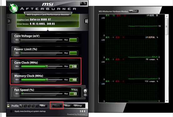 方法三:當上述兩種方法都無法解決該問題,則需要考慮是顯卡的頻率問題引起。可以下載一些降頻軟件,比如:MSI Afterburner、XtremeTuner Plus等,安裝后,修改Core Clock(核心頻率)和Memory Clock(顯存頻率),記住設置后,要點擊Apply(應用)。